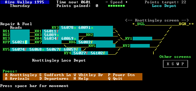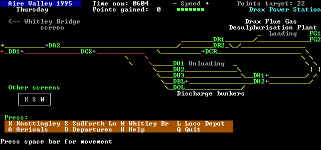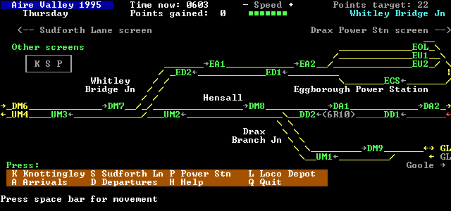 All lines are double track except for the line between Drax Branch Junction and Goole, which is single for most of it's length, as is the East Curve at Knottingley. Sidings for stabling MGR coal wagon sets exist at Sudforth Lane, Pontefract Monkhill and Milford. However, many of these wagon sets are in almost continous service during the day. The locomotive depot is located in the triangle of the junctions at Knottingley, together with the wagon repair shops. The connections into the shops are shown on the displays but no other parts of it are shown in this simulation.