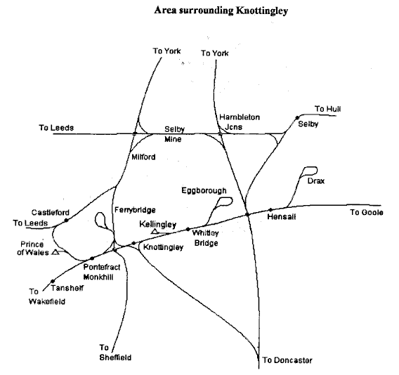 The original Lancashire & Yorkshire Railway line from Wakefield to Goole runs from west to east and in the main route for the Regional Railways service to Knottingley and Goole. The branch to Doncaster, also formerly L&YR, leaves to the south via a triangular junction at Knottingley. This line carries freight traffic to and from the Doncaster district and no passenger services are scheduled, although it is often used as a diversionary route when the main line to Leeds or York is blocked. There is also a connecting curve to the north to Ferrybridge Junction on the former North Eastern Railway to York via Church Fenton; services to Ferrybridge Power Station using the line of the former Hull & Barnsley Railway which closed some years before.