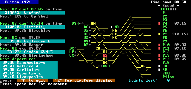 This simulation is set at Euston, the London terminus of the former London and North Western Railway. Euston is the terminus of the electrified main line to Birmingham, Liverpool, Manchester and Crewe, and is seen on a weekday in 1971. You have to direct all the trains in and out, selecting platforms to avoid delays and minimise congestion; you also have to allocate appropriate motive power to each loco-hauled service.