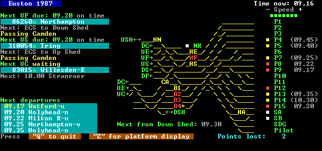 This simulation is set at Euston, the London terminus of the former London and North Western Railway. Euston is the terminus of the electrified main line to Birmingham, Crewe and the north-west, continuing to Glasgow, and is seen at a busy period on a Thursday in summer 1987. You have to direct all the trains in and out, selecting platforms to avoid delays and minimise congestion; you also have to allocate appropriate motive power to each loco-hauled service.