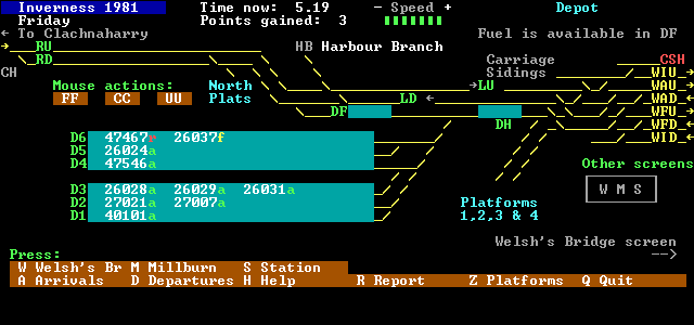 One more screen than the 1970 version, as the growth of North Sea oil traffic increased the demands on Inverness TMD. There are a few through freights, but all scheduled passenger trains terminate at Inverness, which is mainly operated as two stations side by side, one for the north and one for the south and east. Freight traffic included is substantial, particularly on the Perth main line. You have a full 24 hour shift to operate, though it gets quiet at times. The diesel depot is on the site of the former Lochgorm Works, and has a lot to do. Some track simplification had taken place, including singling of the Forres line. The passenger service to Aberdeen had reverted to loco haulage, and the increased traffic had brought an increase in the number of sleeper and Motorail services, as well as extra freights.