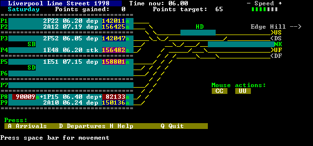 The station is seen in the summer of 1998; you have a choice of weekday or Saturday schedules. There are no conditional or extra trains, though there are some differences between the Saturday and weekday schedules, and one slight variation on Friday. For added realism, some arriving trains will be late.
