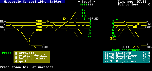 The station is seen on a summer weekday in 1994. Most freight services operate only depending on the traffic available. You have to direct all the trains in and out, selecting platforms to avoid delays and minimise congestion. You will have to plan how to use the available platforms to avoid conflicts between arrivals and departures, and adjustments will be needed when arrivals are running late.