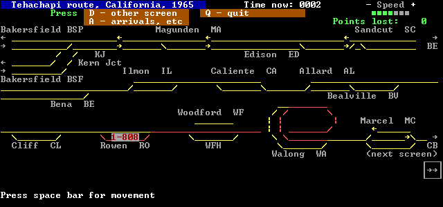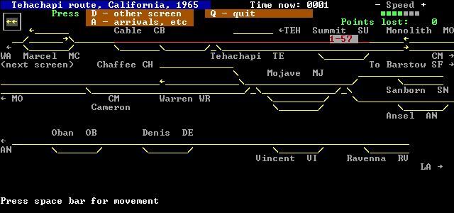 The portion of the route covered by this simulation extends from Kern Junction on the outskirts of Bakersfield to Mojave, where the Santa Fe route to Barstow leaves to the east, continuing southwards to Vincent, at the summit of the line leading to Soledad Canyon and Los Angeles.
